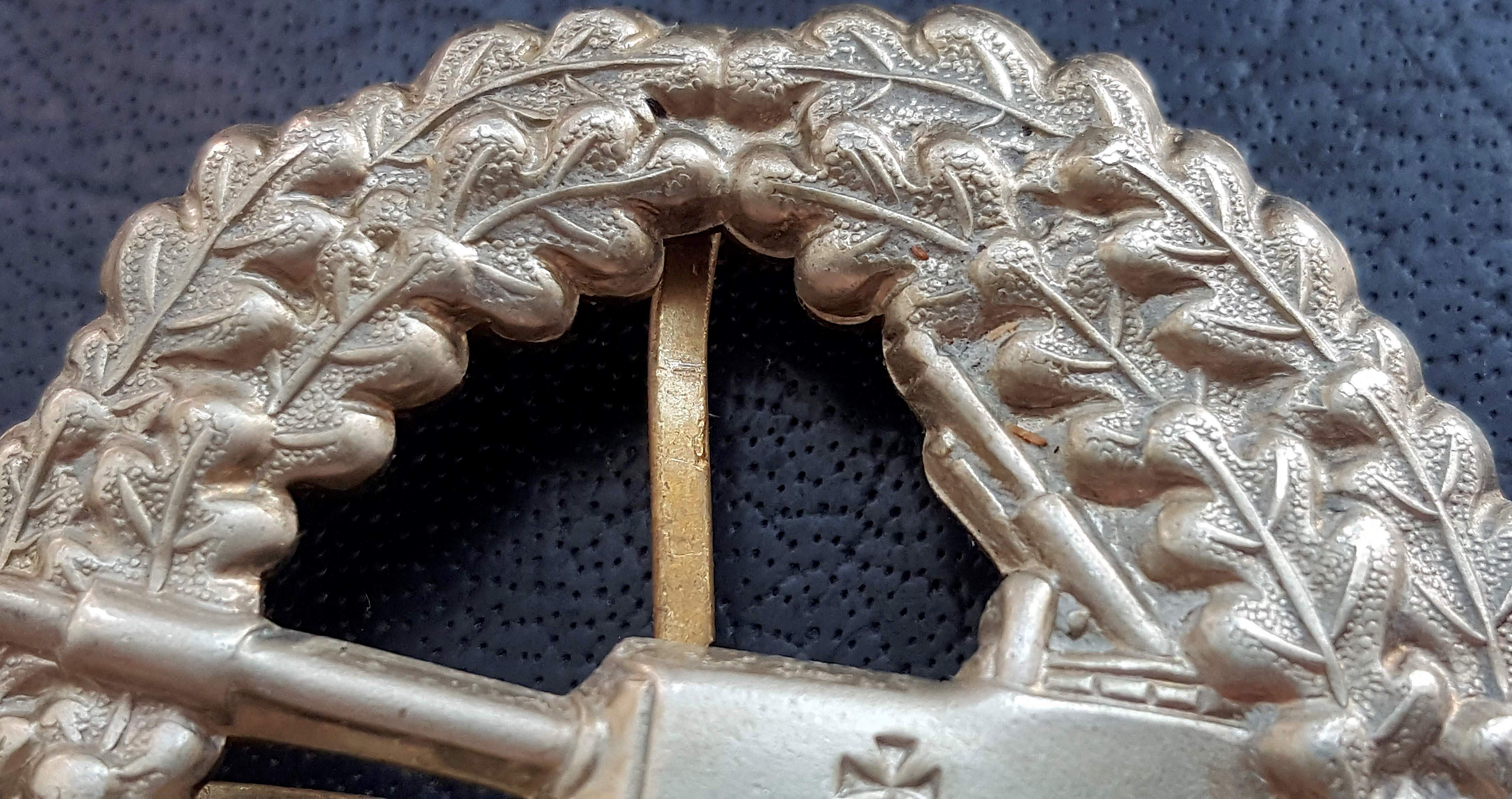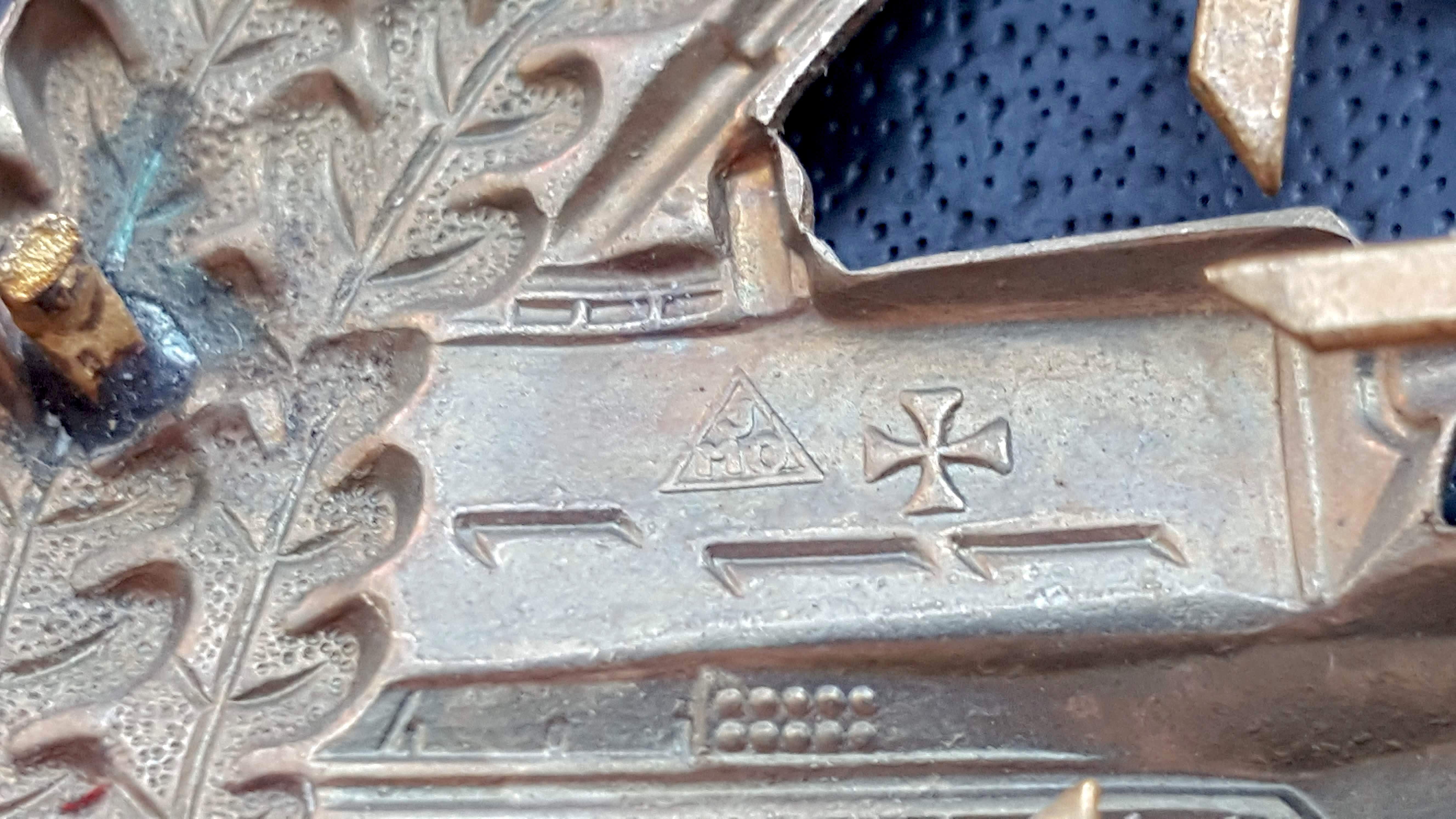 Original post WW2 made German Bundeswehr beret cap badge / panzer corps (Barettabzeichen Panzertruppe der Bundeswehr), EARLY 1ST PATTERN VERSION WITH NO FLAG, IN VERY GOOD WORN CONDITION WITH 3 (INSTEAD OF 4) PRONGS ON THE REVERSE, MAKER MARKED: "JMO" (Julius Maurer - Oberstein), SIZE: cca 53 x 46 mm, SIZE: cca 53 x 46 mm