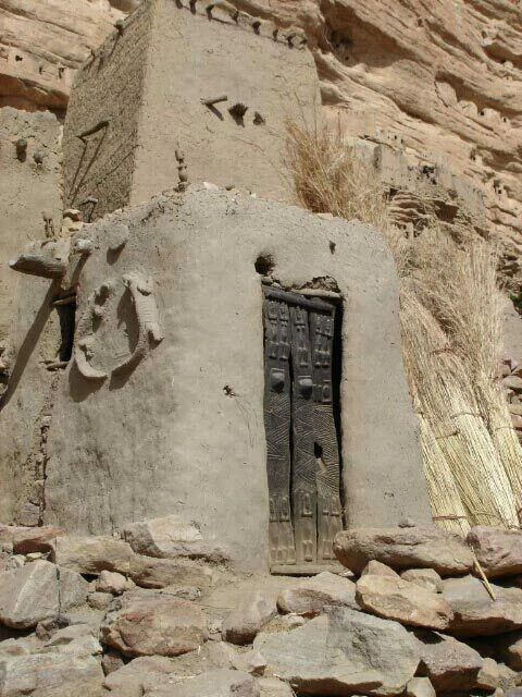 Dogon art is primarily sculpture. Dogon art revolves around religious values, ideals, and freedoms. Dogon sculptures are not made to be seen publicly, and are commonly hidden from the public eye within the houses of families, sanctuaries, or kept with the Hogon (spiritual and political leader of the village). The importance of secrecy is due to the symbolic meaning behind the pieces and the process by which they are made. Themes found throughout Dogon sculpture consist of figures with raised arms, superimposed bearded figures, horsemen, stools with caryatids, women with children, figures covering their faces, women grinding pearl millet, women bearing vessels on their heads, donkeys bearing cups, musicians, dogs, quadruped-shaped troughs or benches, figures bending from the waist, mirror-images, aproned figures, and standing figures. Signs of other contacts and origins are evident in Dogon art. The Dogon people were not the first inhabitants of the cliffs of Bandiagara. Influence from Tellem art is evident in Dogon art because of its rectilinear designs. Bronze, Brass and iron figures are identified with Dogon myths of creation, as the blacksmith was one of the first primordial beings known as Nommo created by Ama who is one of the major Dogon deities. The identity between the Nommo and the blacksmith creates a bond and an identity that gives the blacksmith special powers which include the ability to call down rain so important in Dogon life. Figures such as this would be placed in the Binu sanctuary, a sacred shelter where the Dogon keep objects of magical importance. This sculpture reflects the artistry, power, and authority of the Dogon blacksmith, as it was he who also carved the well-known wooden sculptures used by the Dogon.