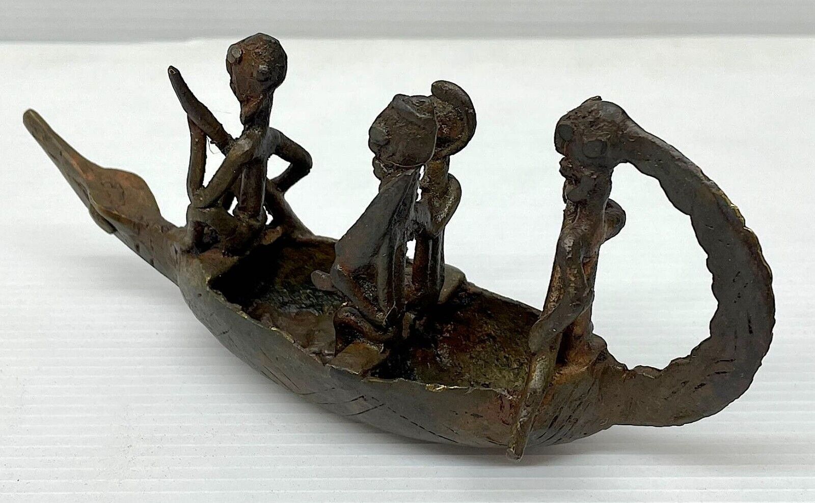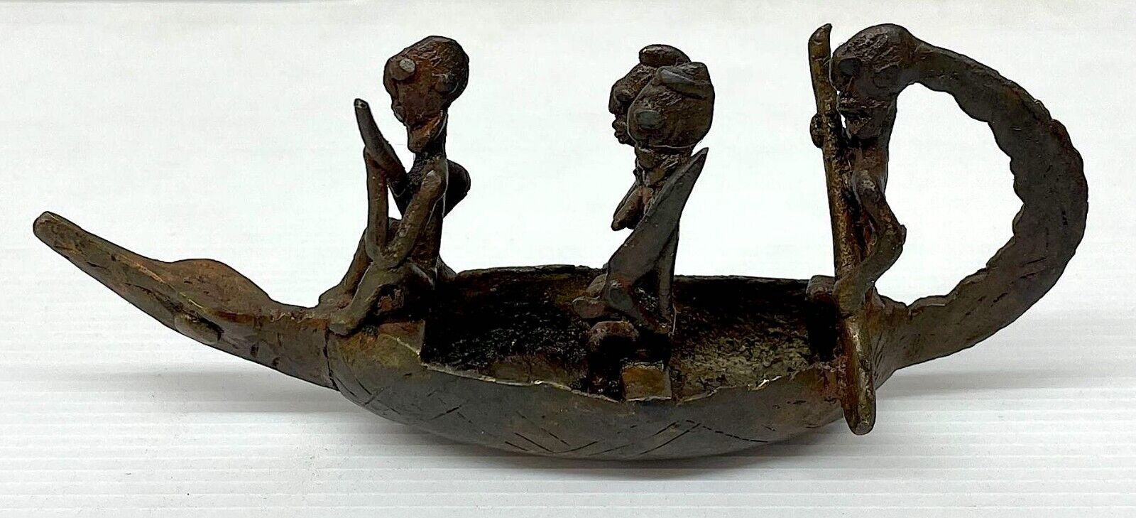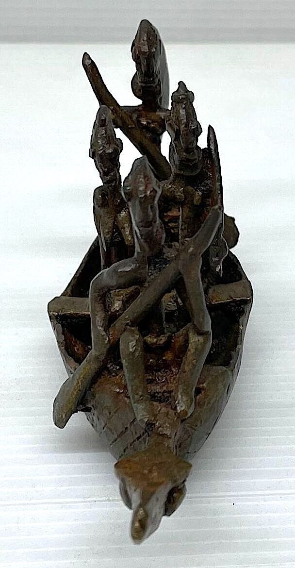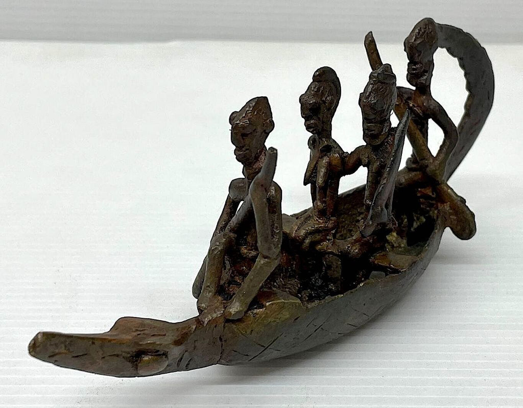 GENUINE AFRICAN DOGON (MALI) BRONZE CROCODILE SPIRIT BOAT, MOST LIKELY FROM THE MID 20TH CENTURY, POSSIBLY EARLIER. A VERY NICE COLLECTIBLE ARTIFACT. DIMENSIONS: CCA 16 X 7 X 5 CM, WEIGHT: CCA 200 GRAMS - UNCLEANED EXAMPLE WITH ATTRACTIVE PATINA, ONLY A THIN OIL HAS BEEN APPLIED - These bronze crocodile boats with passengers depict the myth of the ancestors arriving to the Dogon country on the back of a crocodile. The Dogon revered the crocodile (or caiman) as a totemic animal. The crocodile represents the animal that once belonged to the ancestor binu serou (the water element). Such a sculpture would be kept in a family shrine, or a larger shrine of a priest/spiritual elder. Research also says that such pieces would be given libations to infuse them with power in order to help the humans on earth.