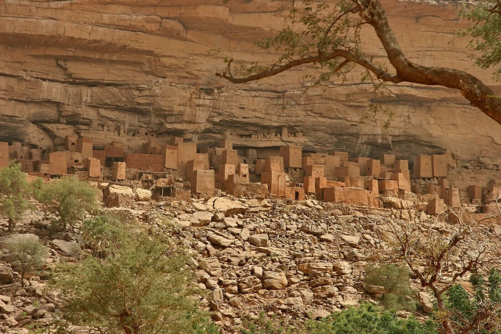 The Dogon are an ethnic group living in the central plateau region of Mali, in West Africa, south of the Niger bend, near the city of Bandiagara and in Burkina Faso. The population numbers between 400,000 and 800,000. They speak the Dogon languages, which are considered to constitute an independent branch of the Niger–Congo language family. The Dogon are best known for their religious traditions, their mask dances, wooden sculpture and their architecture. The principal Dogon area is bisected by the Bandiagara Escarpment, a sandstone cliff of up to 500 m (1,640.42 ft) high, stretching about 150 km (90 miles). To the southeast of the cliff, the sandy Séno-Gondo Plains are found, and northwest of the cliff are the Bandiagara Highlands. Historically, Dogon villages were established in the Bandiagara area in consequence of the Dogon people's collective refusal to convert to Islam a thousand years ago.
