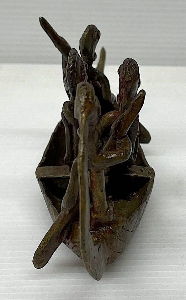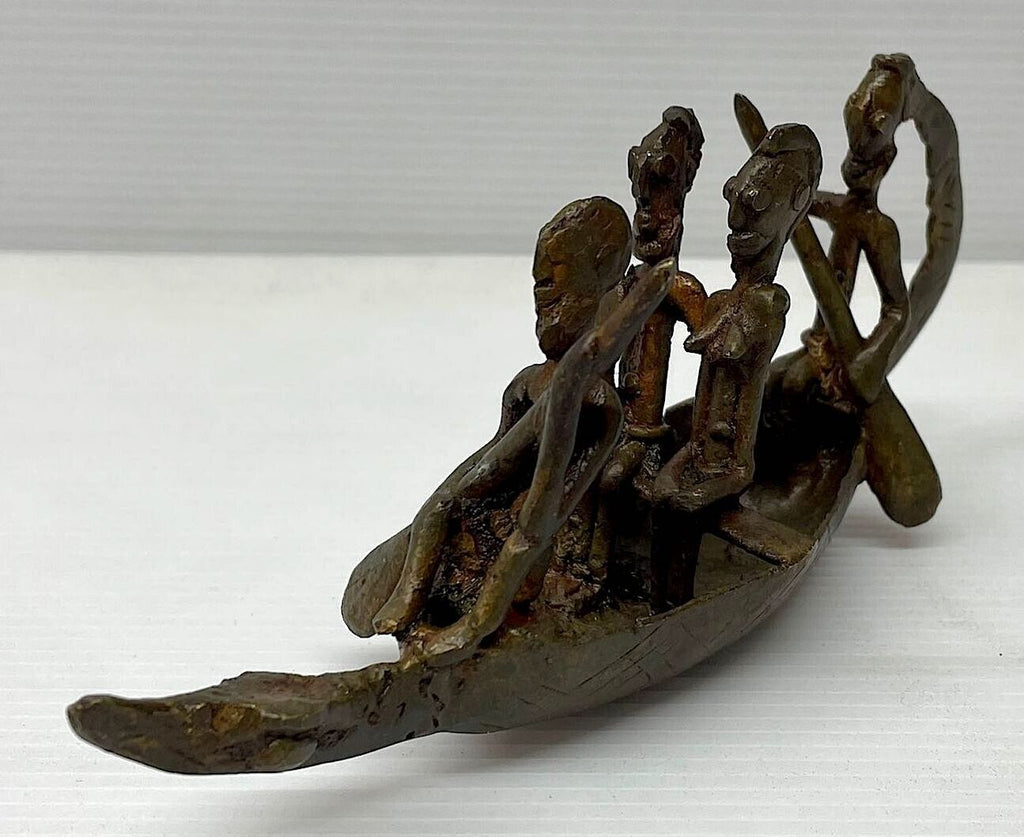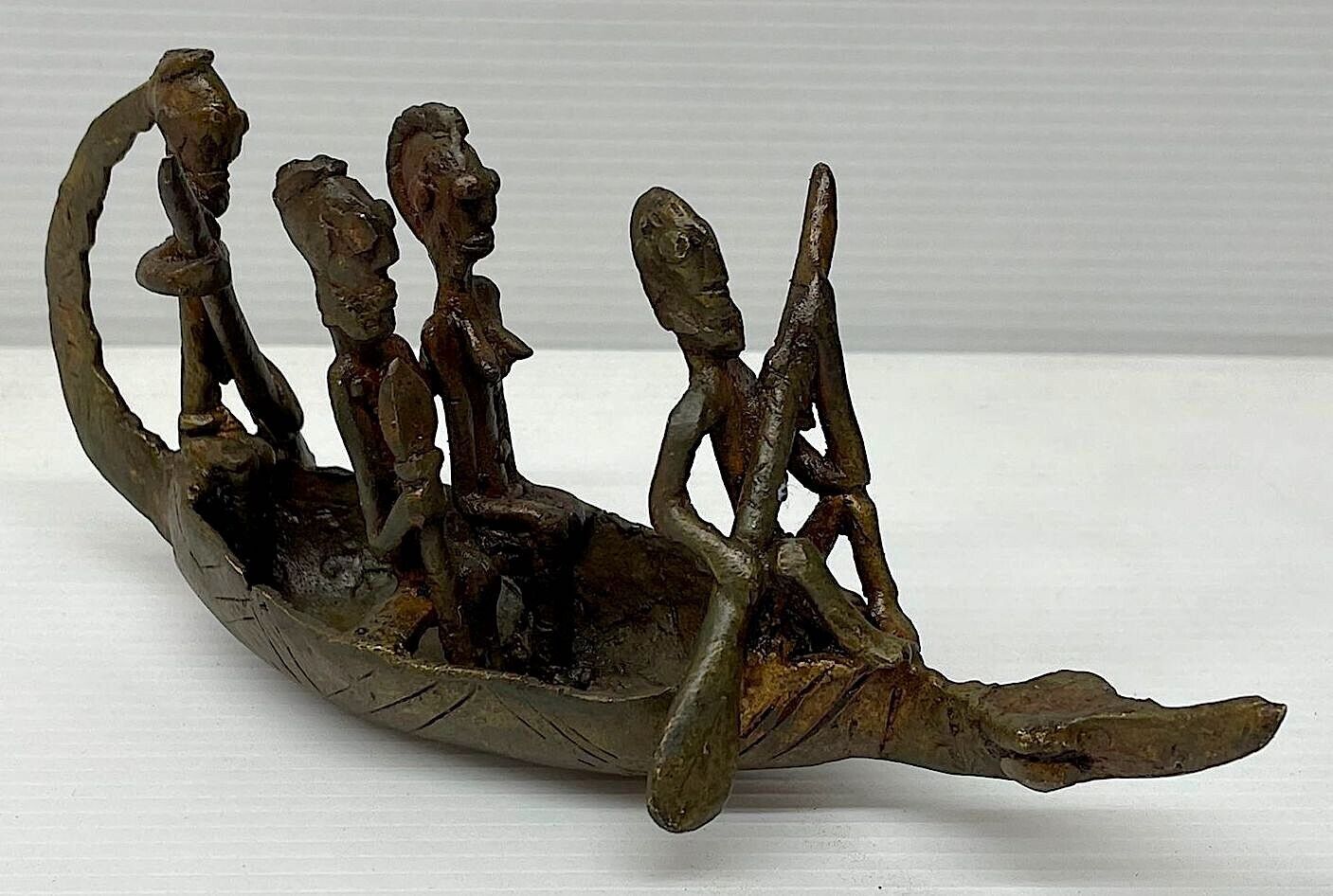GENUINE AFRICAN DOGON (MALI) BRONZE CROCODILE SPIRIT BOAT, MOST LIKELY FROM THE MID 20TH CENTURY, POSSIBLY EARLIER. A REALLY NICE COLLECTIBLE ARTIFACT. DIMENSIONS: CCA 16 X 7 X 5 CM, WEIGHT: CCA 200 GRAMS - UNCLEANED EXAMPLE WITH ATTRACTIVE PATINA, ONLY A THIN OIL HAS BEEN APPLIED - These bronze crocodile boats with passengers depict the myth of the ancestors arriving to the Dogon country on the back of a crocodile. The Dogon revered the crocodile (or caiman) as a totemic animal. The crocodile represents the animal that once belonged to the ancestor binu serou (the water element). Such a sculpture would be kept in a family shrine, or a larger shrine of a priest/spiritual elder. Research also says that such pieces would be given libations to infuse them with power in order to help the humans on earth.